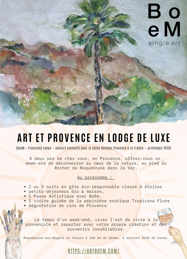 Vivez une parenthèse artistique au cœur de la Provence ! Vivez une expérience artistique dans un cadre exceptionnel ! Plongez dans l’art de vivre à la provençale le temps d’un séjour exclusif : création artistique, détente, nature et saveurs locales. En partenariat avec Tropicana Lodge, BoeM vous invite à découvrir une nouvelle manière de voyager :👉 Créer, partager, se ressourcer dans un cadre exceptionnel, dans un cocon de verdure, au pied du Rocher de Roquebrune. Nos packages artistiques sur mesure combinent :
