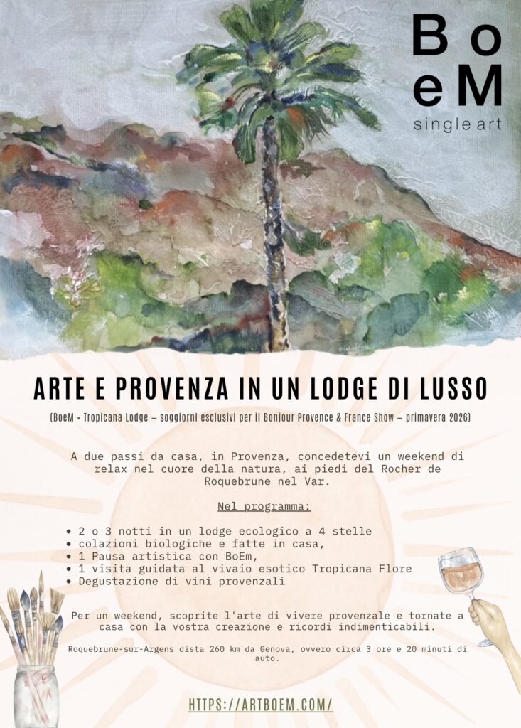 ✨ Un’esperienza unica da scoprire al Salone Bonjour Provence et la France a Genova dal 16 al 20 ottobre 2025. Vivi una parentesi artistica nel cuore della Provenza. Immergiti nell’arte di vivere provenzale durante un soggiorno esclusivo: creazione artistica, relax, natura e sapori locali.